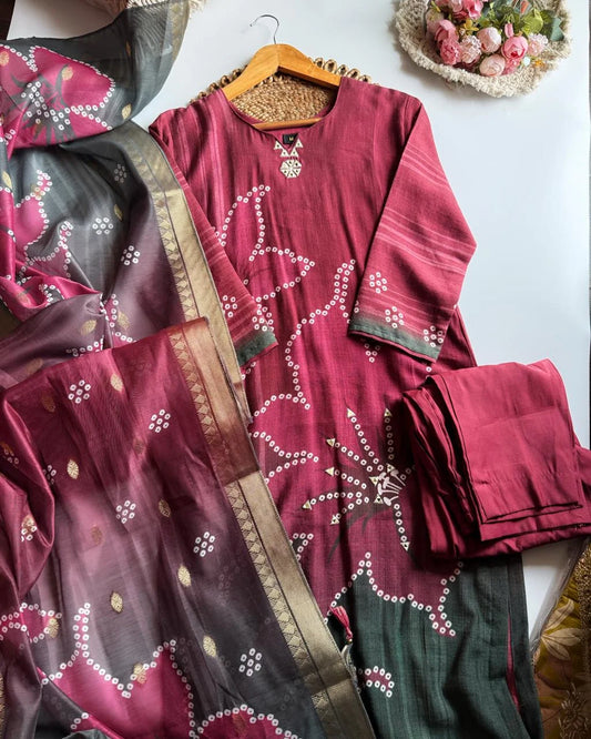 Pure Cotton Bandhej Suit -Wine