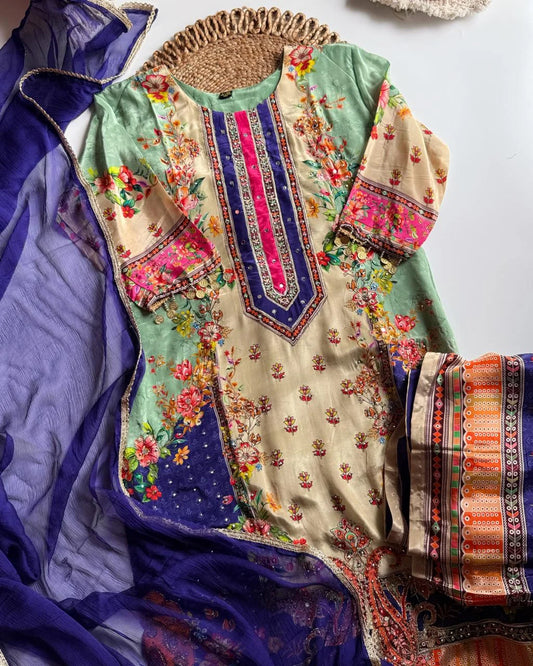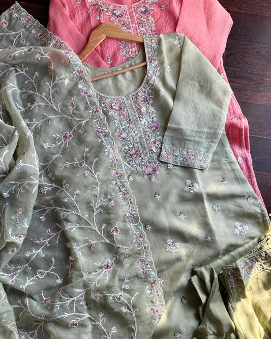 Premium shimmer Organza Embroidery Suit -Pista Green