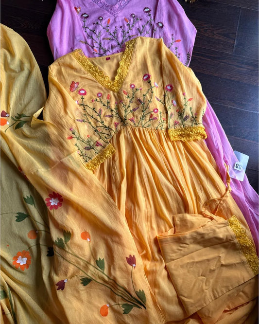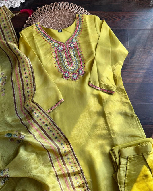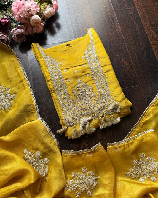 Pure Dola Silk Hand Work Suit – Golden Mustard