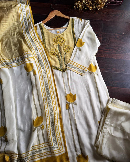Premium Russian Silk Hand work Suit -Ivory