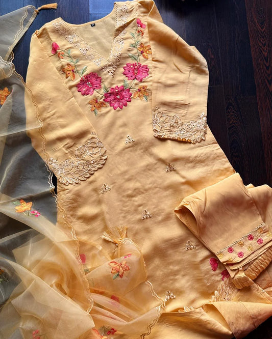 Roman Silk Sciffli Detailed Suit – Light Yellow