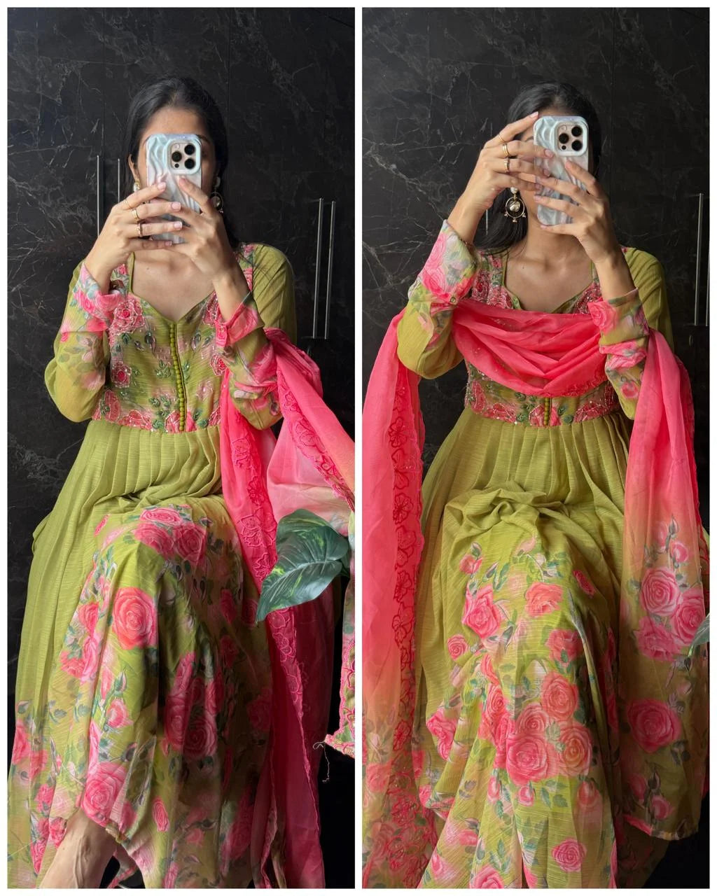 This Premium Chiffon Hand Work Anarkali combines comfort with elegant craftsmanship. Its soft chiffon fabric drapes gracefully, while the intricate hand embroidery adds a delicate, refined touch. Perfect for festive or special occasions, this Anarkali helps you feel both comfortable and beautifully dressed, supporting your confidence and style every step of the way.